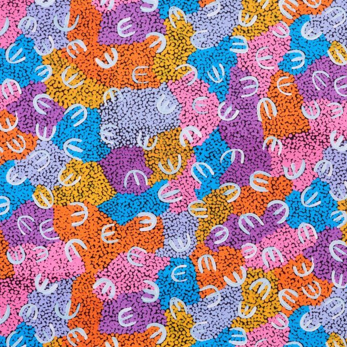 Janganpa Jukurrpa (common brush-tail possum Dreaming) travels all over Warlpiri country. 'Janganpa' are nocturnal animals that often nest in the hollows of white gum trees ('wapunungka'). This story comes from a big hill called Mawurrji, west of Yuendumu and north of Pikilyi (Vaughan Springs). A group of 'janganpa' ancestors resided there. Every night they would go out in search of food. Their hunting trips took them to Wirlki and Wanapirdi, where they found 'pamapardu' (flying ants). They journeyed on to Ngarlkirdipini looking for water. A Nampijinpa women was living at Mawurrji with her two daughters. She gave her daughters in marriage to a Jupurrurla 'janganpa' but later decided to run away with them. The Jupurrurla angrily pursued the woman. He tracked them to Mawurrji where he killed them with a stone axe.